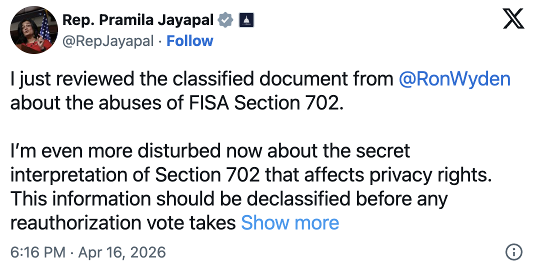 Last week, Senator Wyden sent a classified document to colleagues on the dangerous abuses of Section 702. Representative Jayapal publicly responded: