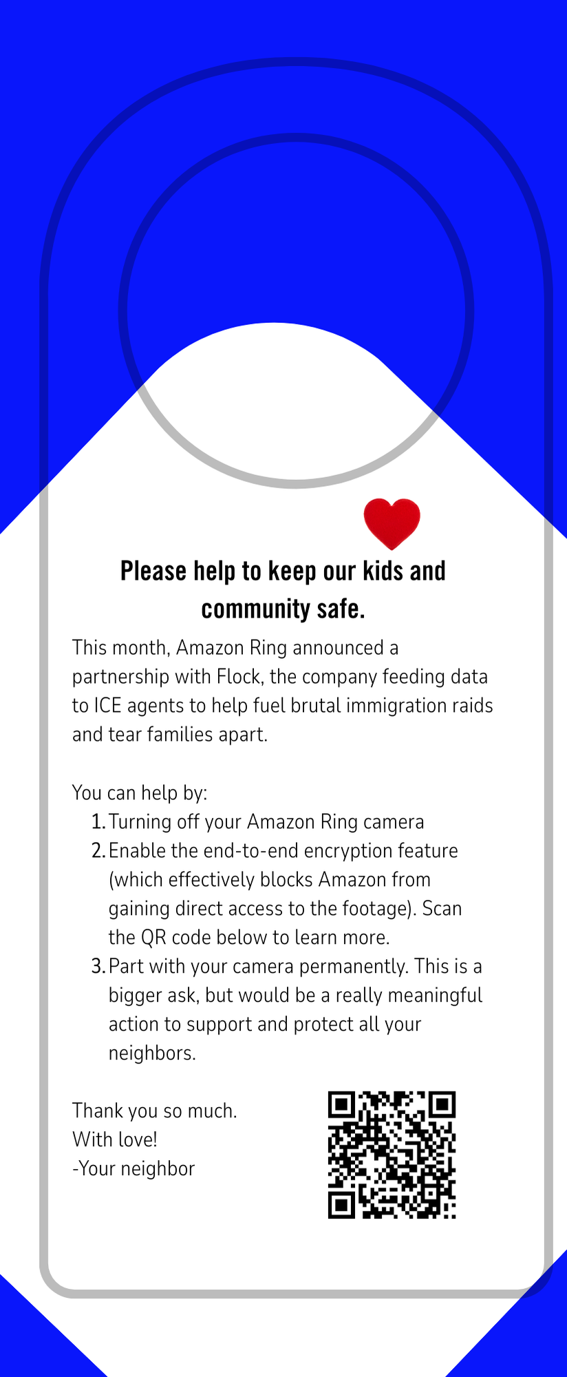 Just last year, Amazon Ring announced a partnership FLOCK making every doorbell and porch another tool of mass surveillance. That’s why we’ve created these doorhangers, an easy and gentle conversation starter for your neighborhood RING users. Feel free to distribute at your next neighborhood ICE watch meeting.