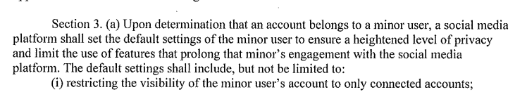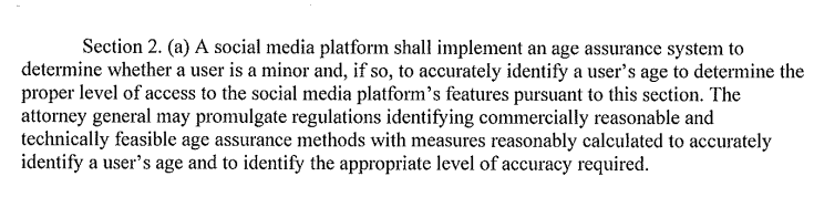 - Requires age verification (left to AG to enforce but this means an ID check or face scan) at the app / website level. This is the most invasive and unsafe form of age assurance.