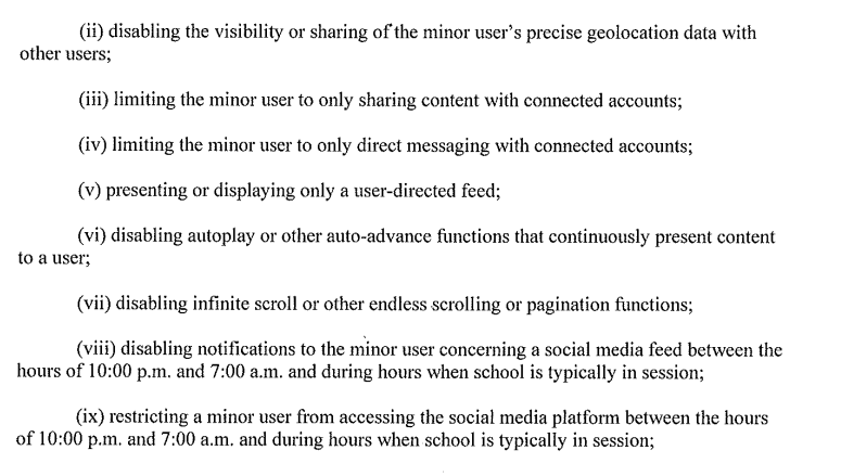 No major concerns here other than that most of these default settings should apply to ALL users, not just minors, and should not require an ID check to turn on or off. Unclear if social media platforms are supposed to keep track of school vacations, etc?
