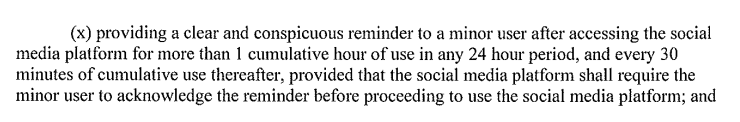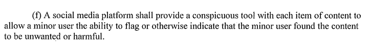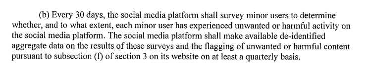 This sounds like a fine idea, and something social media companies can and should do, but again I am pretty sure this violates the First Amendment protection against compelled speech. I am unsure what a constitutional attorney would say about whether this is not only compelled speech on the part of the company, but also on the part of the minor user who is being asked to fill out the (government mandated) survey.