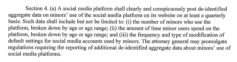 - Requires companies to report on the number of minor users they have in a way that will force them to know the exact age of every user (ID checks) and store that data indefinitely.