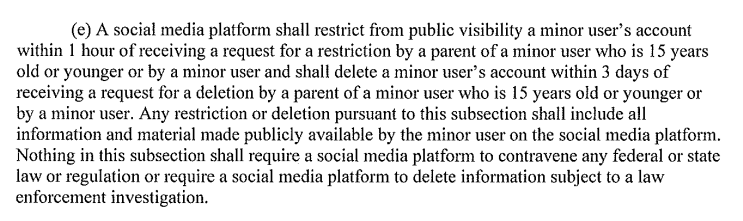 And this requirement itself is wild: a parent—or someone claiming to be a parent, and again there is no good way for a company to know the difference—can simply request to get an account shut down and then the company must “hide” it within an hour and delete it completely, along with all data, in 3 days.
