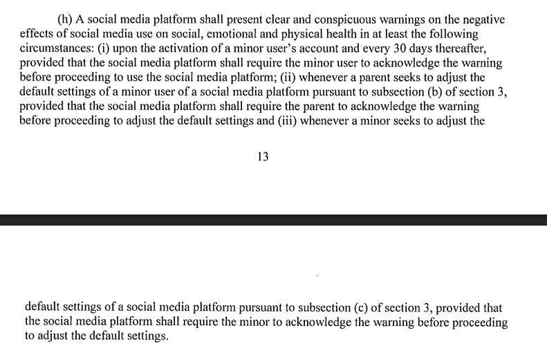I am not an expert on the lines around “compelled speech” as it relates to product warnings but I am guessing that the ACLU attorneys are gonna have a heart attack with this one. I think warnings are a good idea, but it would be extremely difficult to legislate what exactly they should say. The data on harm from social media use is significantly more nuanced and complicated than breathless headlines suggest. While a pack of cigarettes can say “The Surgeon general warns TKTK,” it’s really not clear what, say, your Bluesky account should tell you about the potential harm of arguing with people on the internet for too long.
