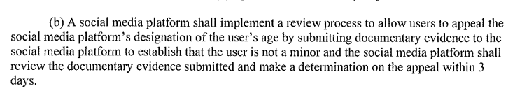 An appeals process is always good. However, this again would require users to submit even more sensitive data to social media companies in order to speak online. And the requirement that platforms review and act within 3 days is doable for giants like Instagram and YouTube, but totally impossible for small, open source, volunteer run platforms, or even medium sized companies like Bluesky.