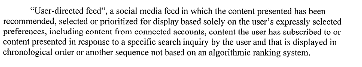 This is fine / good (and is already standard on most major social media platforms). But the bill’s definition of algorithmic feed would actually prevent platforms from doing anything with the information when users flag unwanted content.