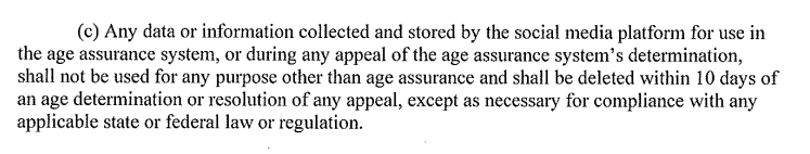 Deleting age assurance data immediately after verification is a best practice in terms of reducing (not removing) the harm of these systems. But this contradicts other requirements in the bill that would force social media companies to store this data indefinitely in case a parent requests it.